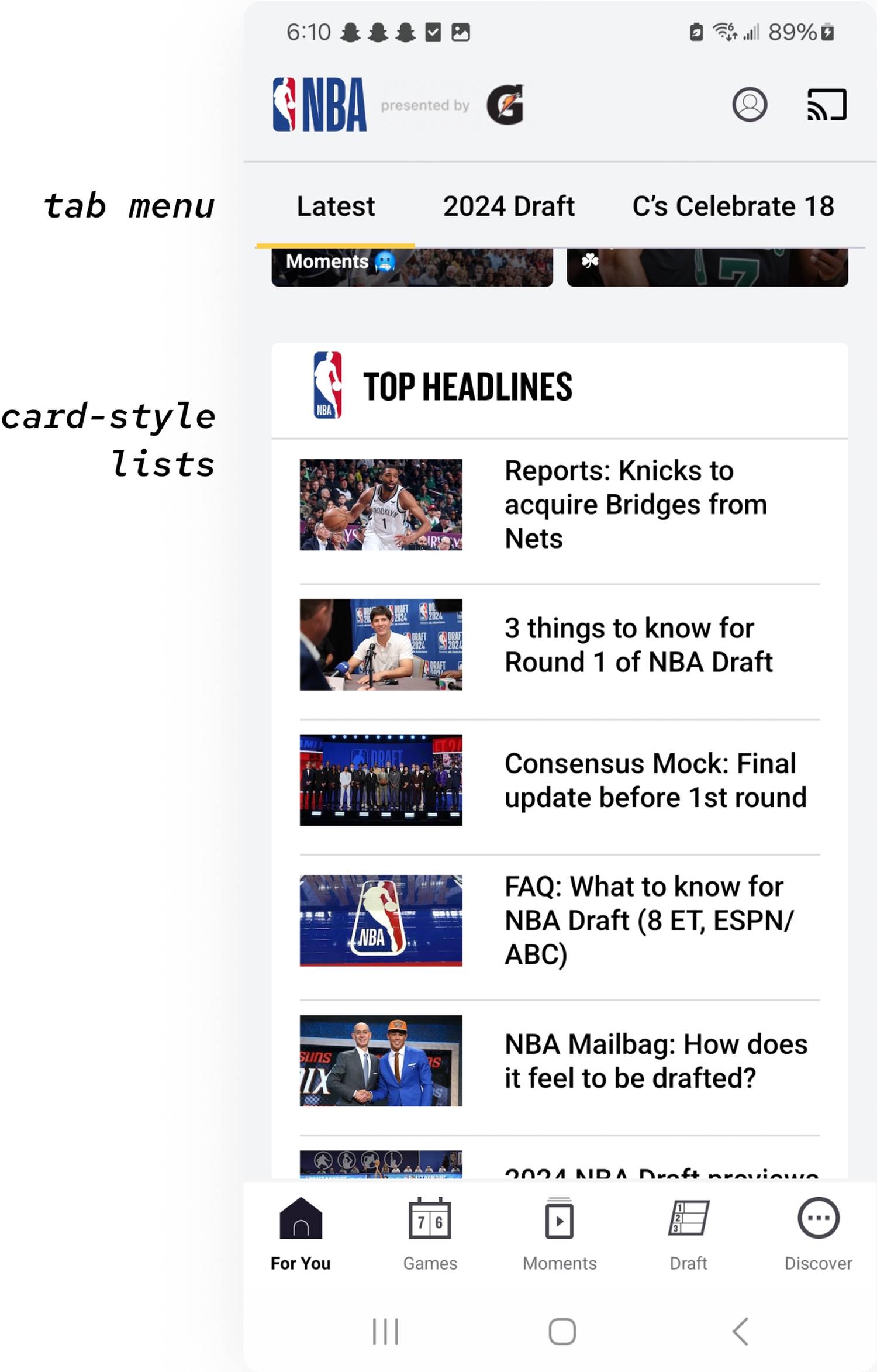 I looked into news brands like Washington Post, as well as media apps like Youtube. I also did an in-depth analysis on the NBA app, which was newly updated at the time.