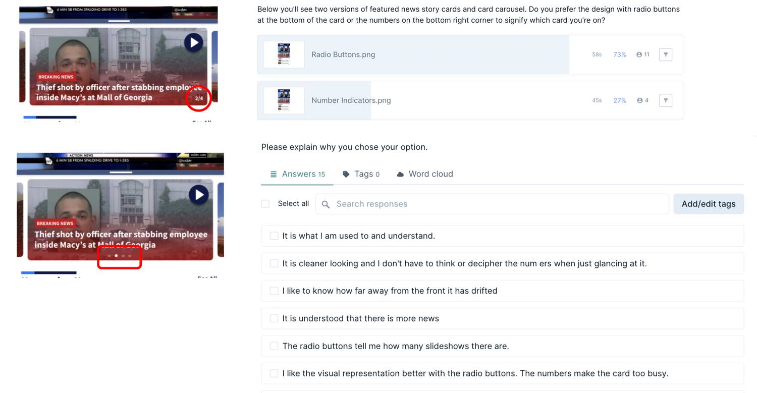 - Out of 15 participants, 11 preferred radio buttons over numbers to help signify their spot in the carousel (73%)
